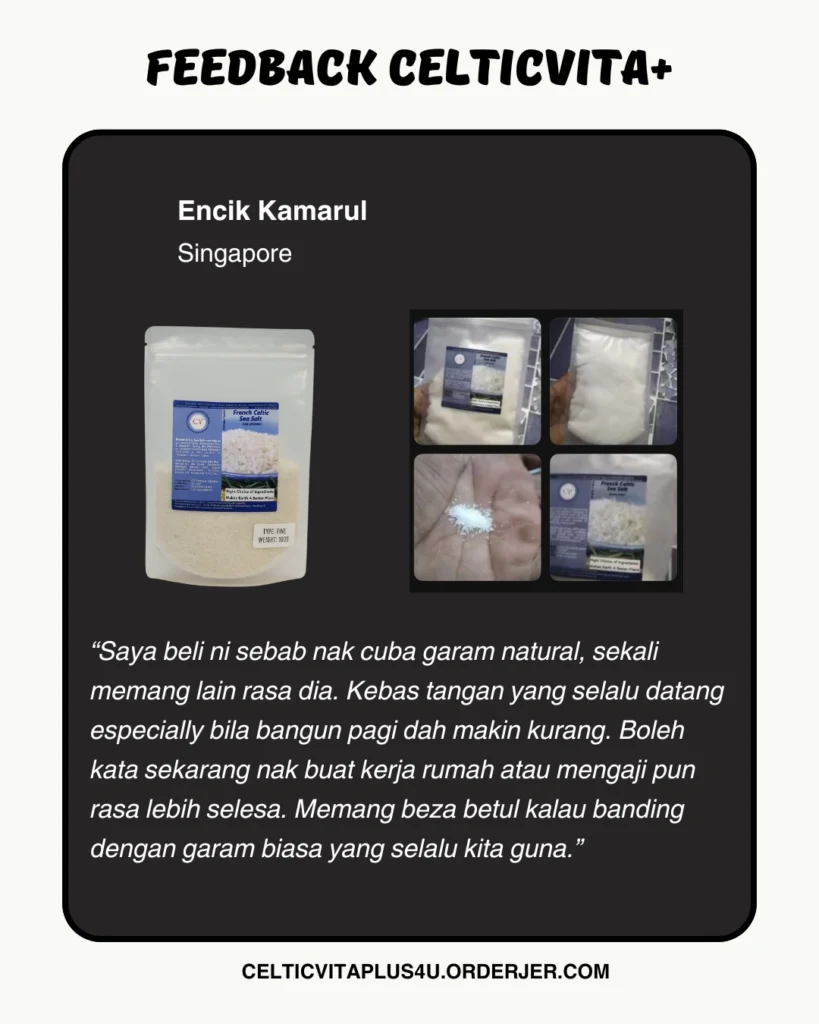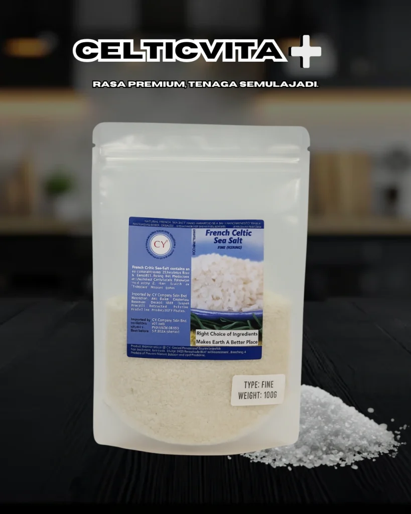Garam semulajadi dari Perancis – kaya mineral, rasa asli & pelbagai kegunaan! Dituai dengan tangan menggunakan kaedah tradisional ratusan tahun, CelticVita+ bukan sekadar garam biasa – tapi sumber mineral tulen yang beri rasa lebih enak & kesihatan lebih baik.